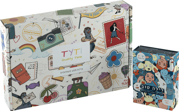 TYTI יוצרת משחקים שמחזקים קשרים בתוך המשפחה, בדיוק ברגעים שאנחנו הכי רוצים להיות קרובים ולא ממש מצליחים כמו סוף היום או חופשה משפחתית כל משחק שלנו משלב שיחה קצרה ופעילות נעימה ומאפשר להורים ולילדים לייצר זמן איכות אמיתי בדיוק בזמן שבו הם הכי צריכים אותו, ללא מאמץ.